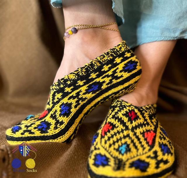 Traditionelle iranische Stricksocken in Gelb/Schwarz – handgefertigt ohne Nähte.